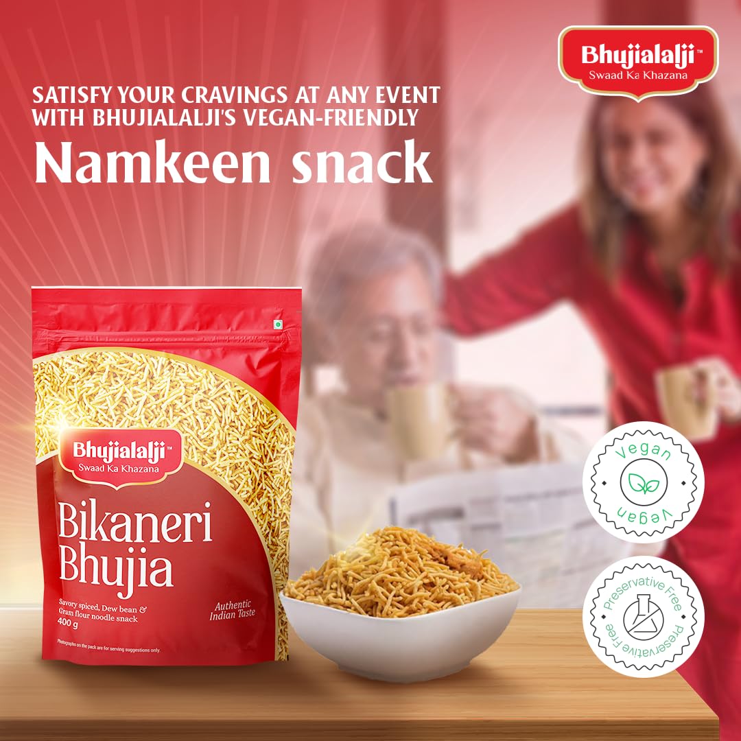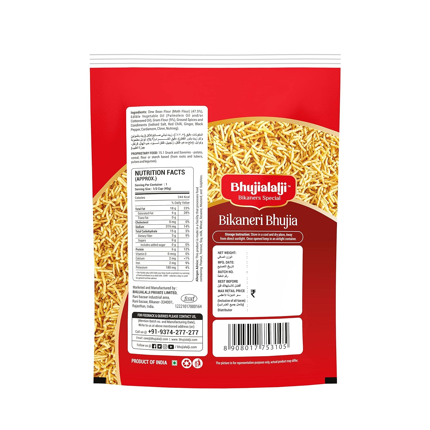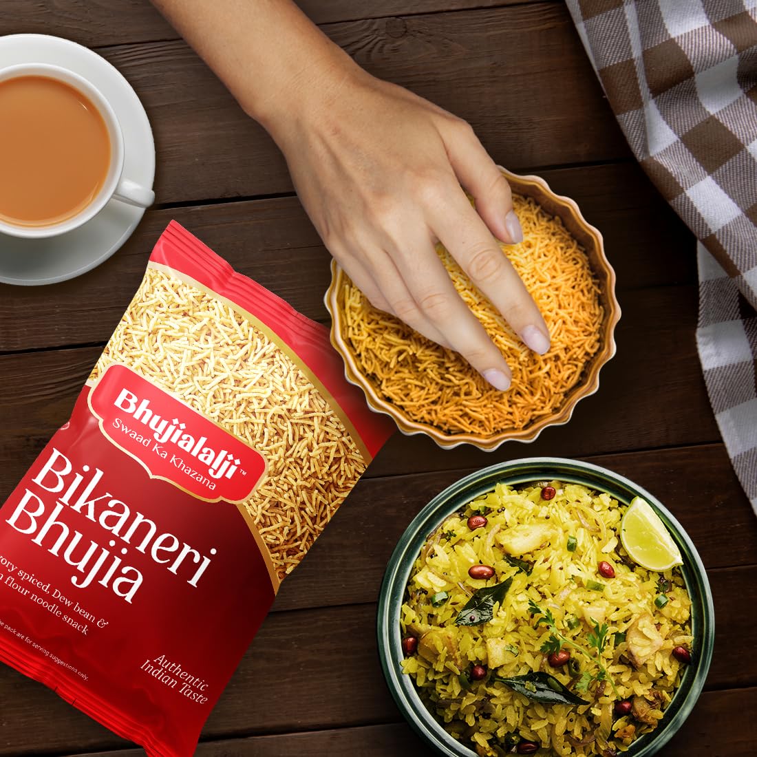 Enjoy the authentic taste of Rajasthan with Bhujialalji Bikaneri Bhujia. Made from dew beans, gram flour, and a blend of traditional Indian spices, this 1kg pack offers a crunchy, flavorful snack perfect for any time. Ready to eat and deeply satisfying, it’s an ideal treat for your tea-time or gatherings. Experience the all-time favorite Indian namkeen that brings a burst of spice and texture in every bite.