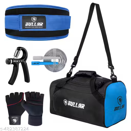 Elevate your fitness routine with the BULLAR Gym Accessories Set. This premium kit includes a weight lifting belt, workout gloves, hand gripper, jump rope, and a sturdy duffle bag for organized gear storage. Designed to support your strength, endurance, and agility, it offers everything you need for a complete workout experience. Crafted in India with quality materials, this set helps you train smarter and stay motivated wherever you go.