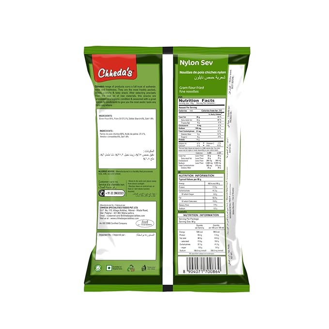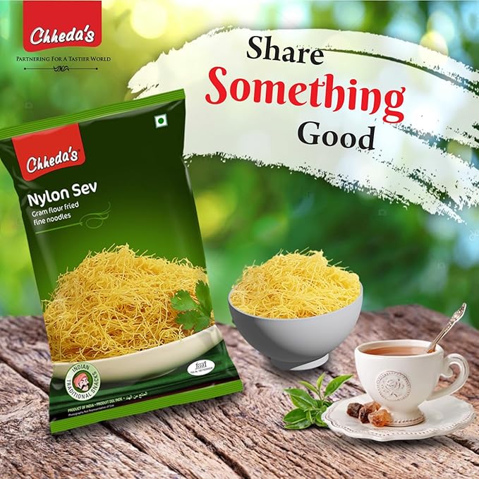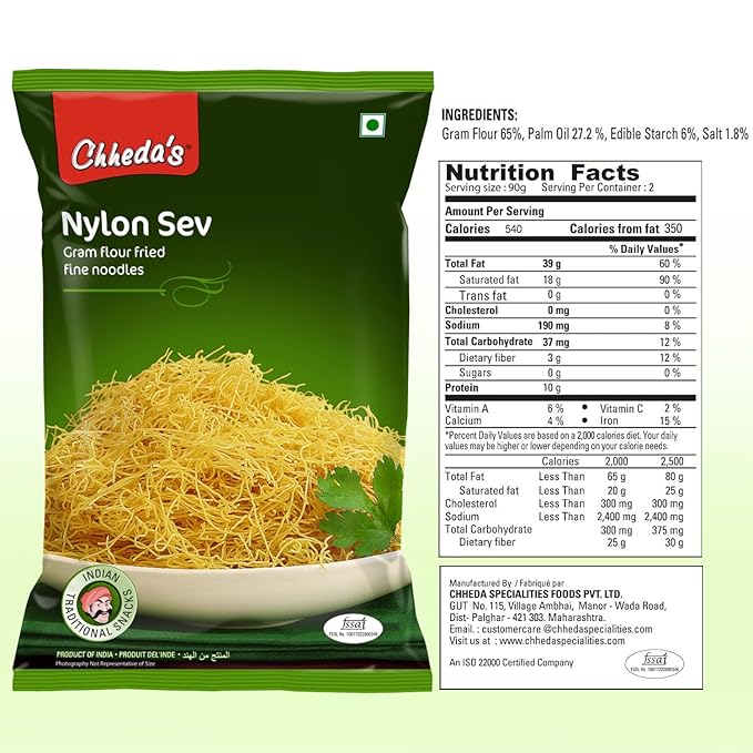 Chheda's Nylon Sev is a delicious, vegetarian snack made from gram flour, palm oil, and salt. This low-fat treat is rich in fiber and contains no cholesterol or trans fat, making it a healthier choice for your snacking needs. Perfect for enhancing sev puri, bhel puri, or enjoyed on its own, it comes conveniently packed in a 300-gram pouch with a shelf life of six months. Add a crispy, flavorful crunch to your snacks with Chheda's Nylon Sev today.