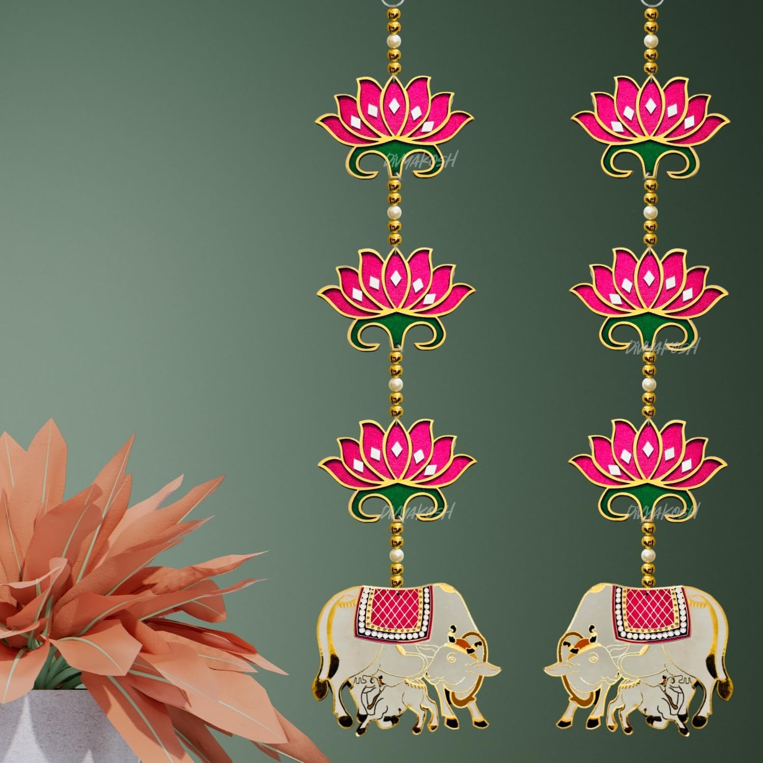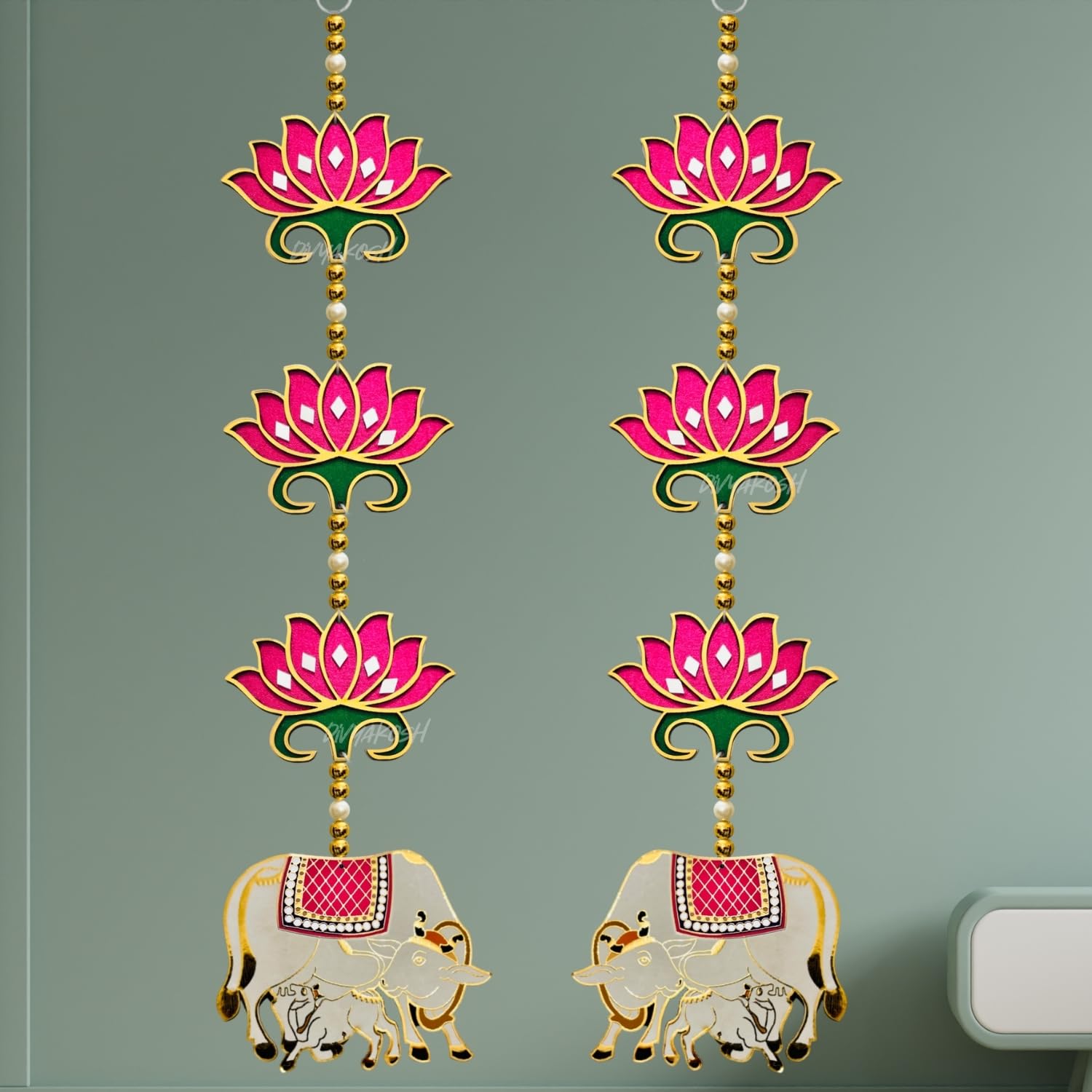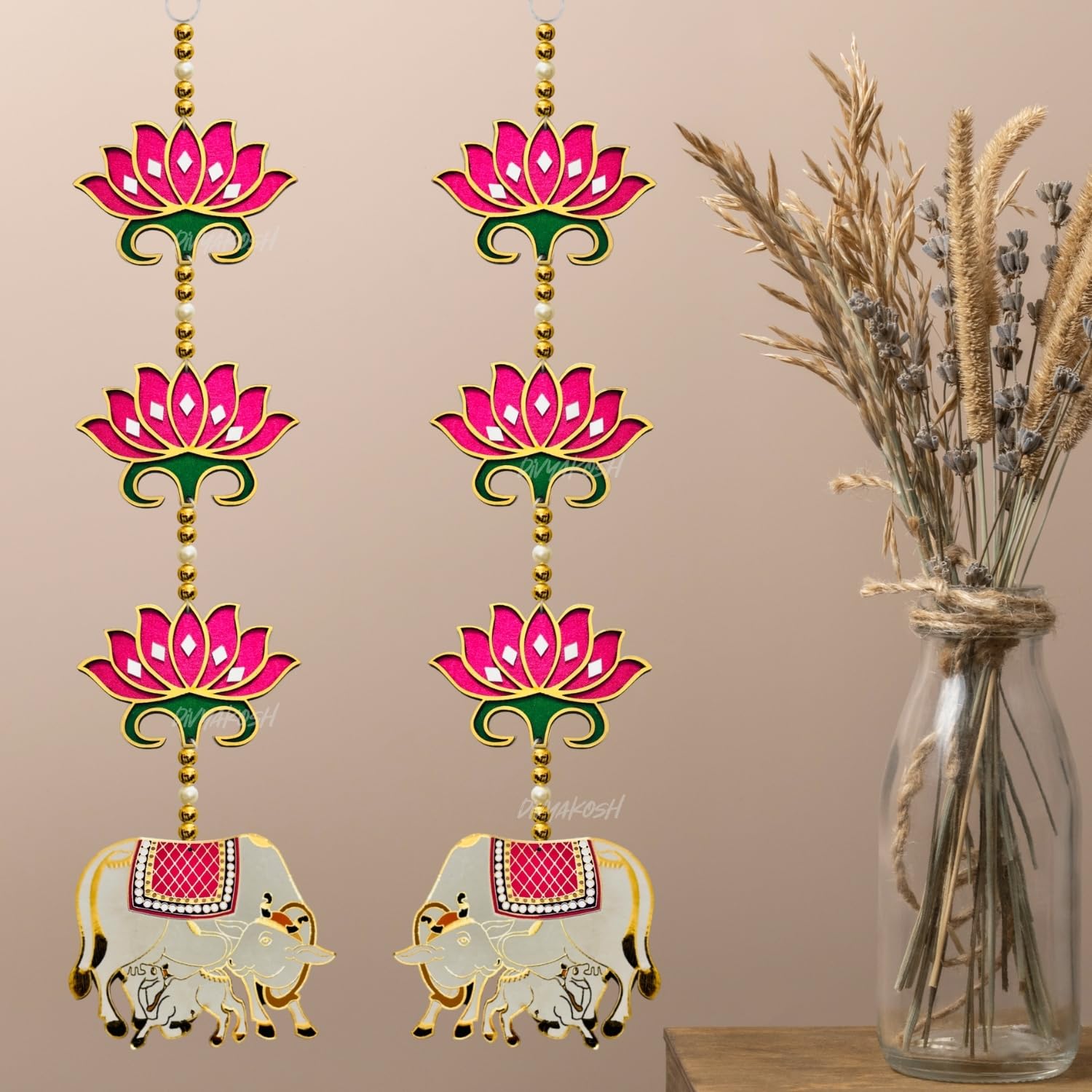 Divyakosh rosewood Door Entrance Hanging, Mandir Door Decorations Items, Pink Lotus with Cowcalf Style Hanging, Ganpati Decor & Diwali Decoration|Door Hanging|2 Pieces|23 Inch |