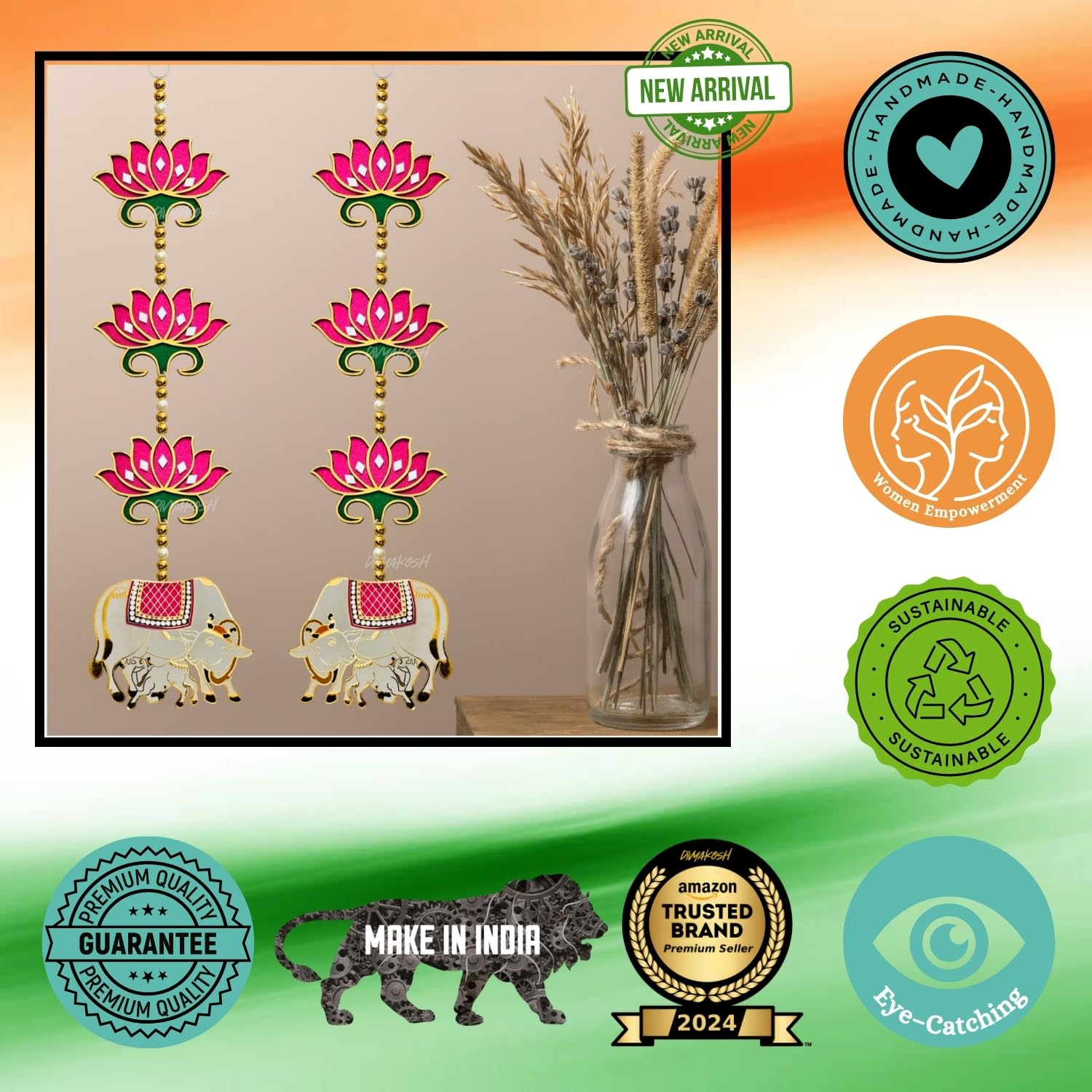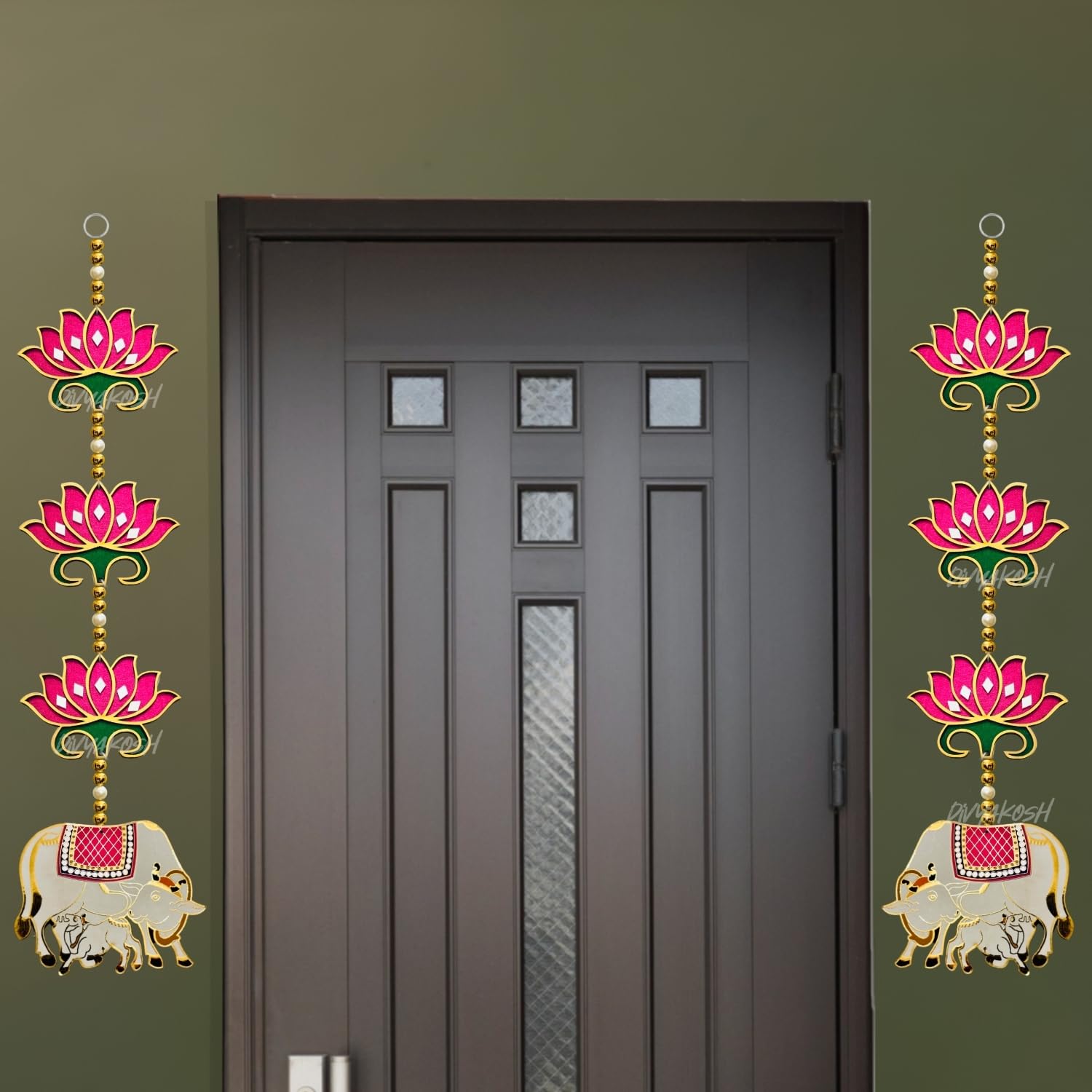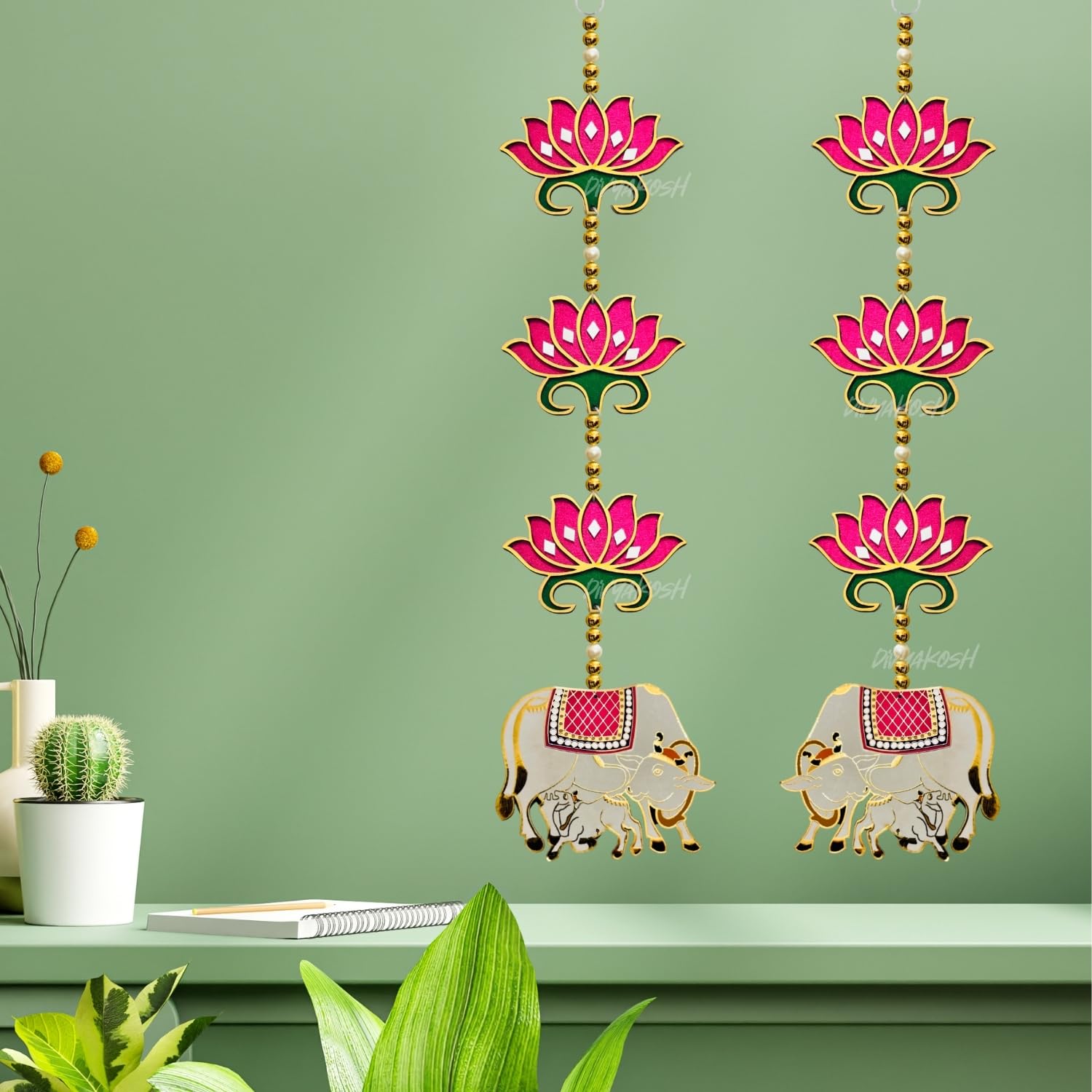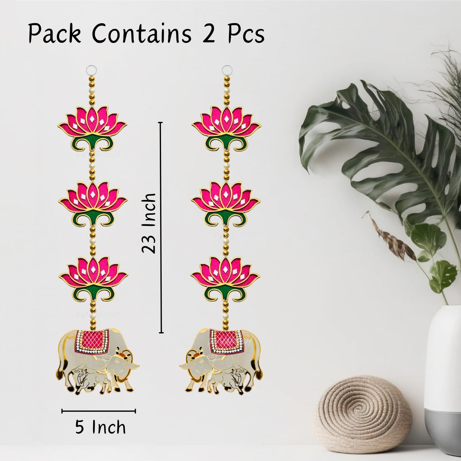 Divyakosh rosewood Door Entrance Hanging, Mandir Door Decorations Items, Pink Lotus with Cowcalf Style Hanging, Ganpati Decor & Diwali Decoration|Door Hanging|2 Pieces|23 Inch |