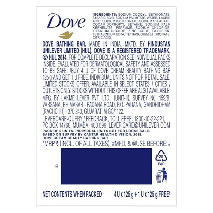 Dove Cream Beauty Bathing Bar (Pack of 5) 125g each For 24 Hour Nourished Skin with ¼ Moisturising Cream and Nutrient Serum