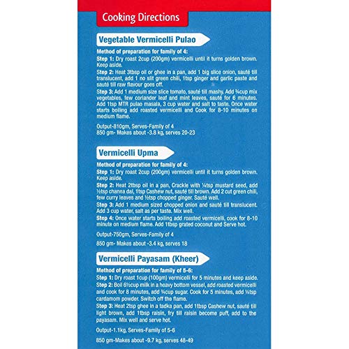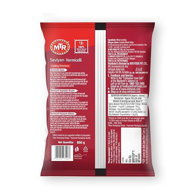MTR Vegetarian Seviyan Vermicelli offers 850 grams of high-quality, wheat semolina vermicelli perfect for creating a variety of delicious sweet and savory dishes. This nutritious and wholesome product supports healthy eating while adding delightful texture and flavor to your meals. Ideal for quick family favorites or festive treats, it brings both versatility and taste to your kitchen.