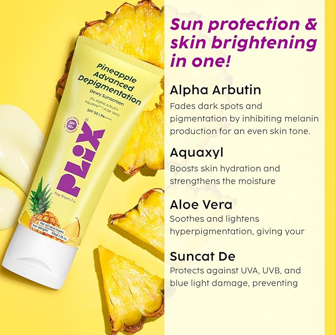 PLIX - THE PLANT FIX Pineapple Advanced Depigmentation Dewy Sunscreen SPF 50 PA++++ | Alpha Arbutin & Aquaxyl | Reduces Pigmentation, Protects from UV & Blue Light, Hydrates Skin | Vegan & Paraben-Free | 50g