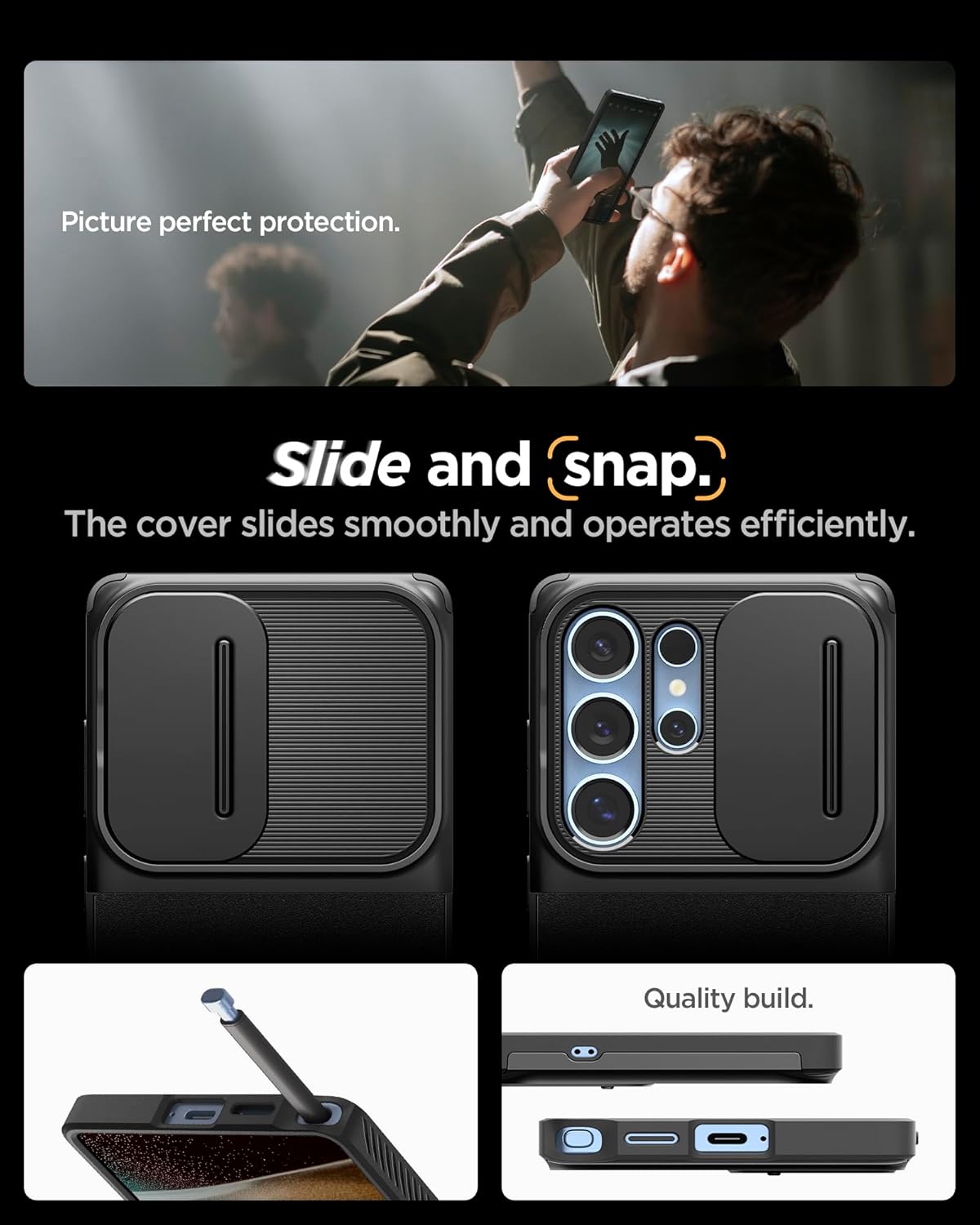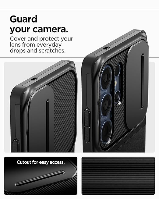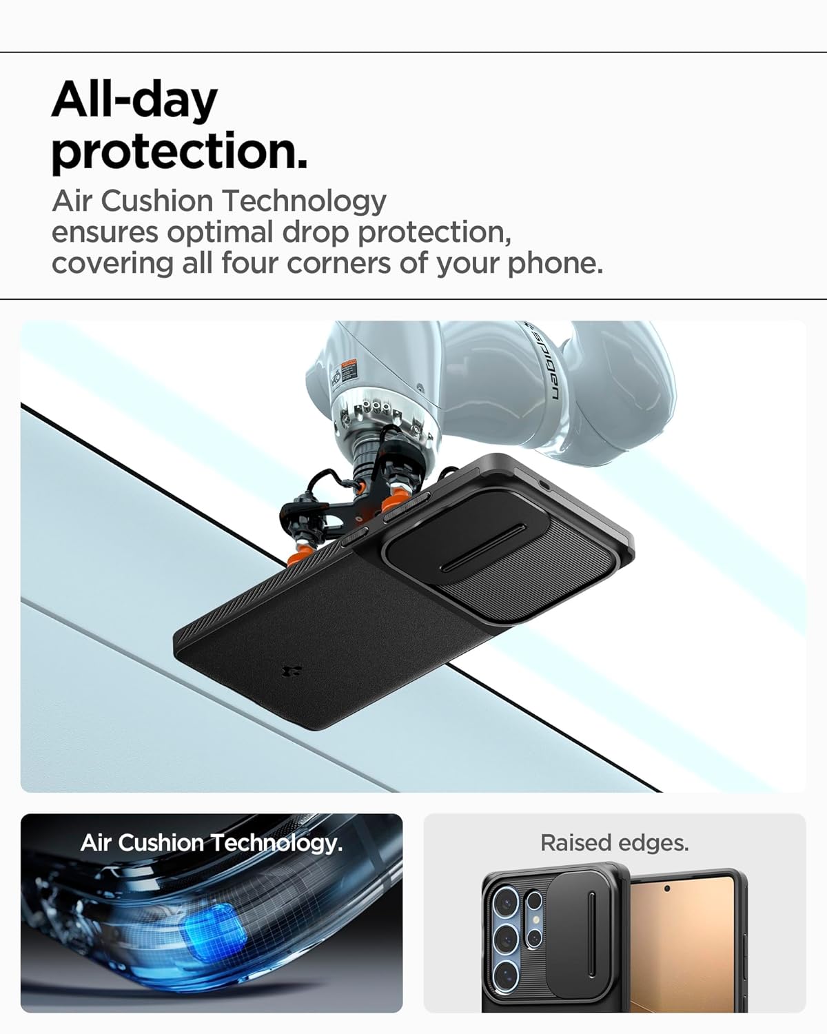 Protect your Samsung Galaxy S25 Ultra with the Spigen Optik Armor case, expertly crafted by Spigen for a perfect fit. This black back cover combines a durable polycarbonate shell with flexible TPU for superior defense. Licensed under the Samsung Mobile Partnership Program, it features a hybrid dual-layer design that offers Mil-Grade protection and Air Cushion Technology to absorb shocks and impacts. Experience reliable, stylish protection tailored specifically for your Galaxy S25 Ultra.