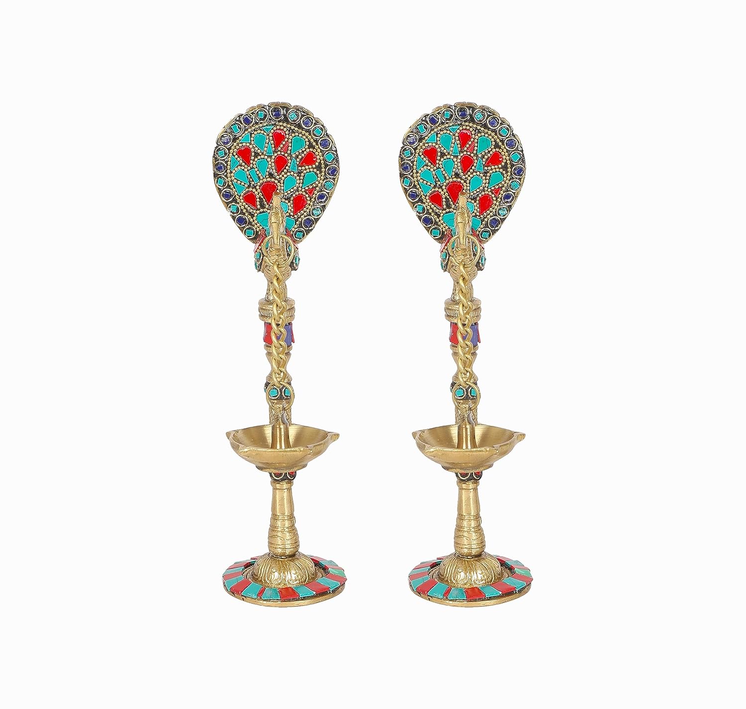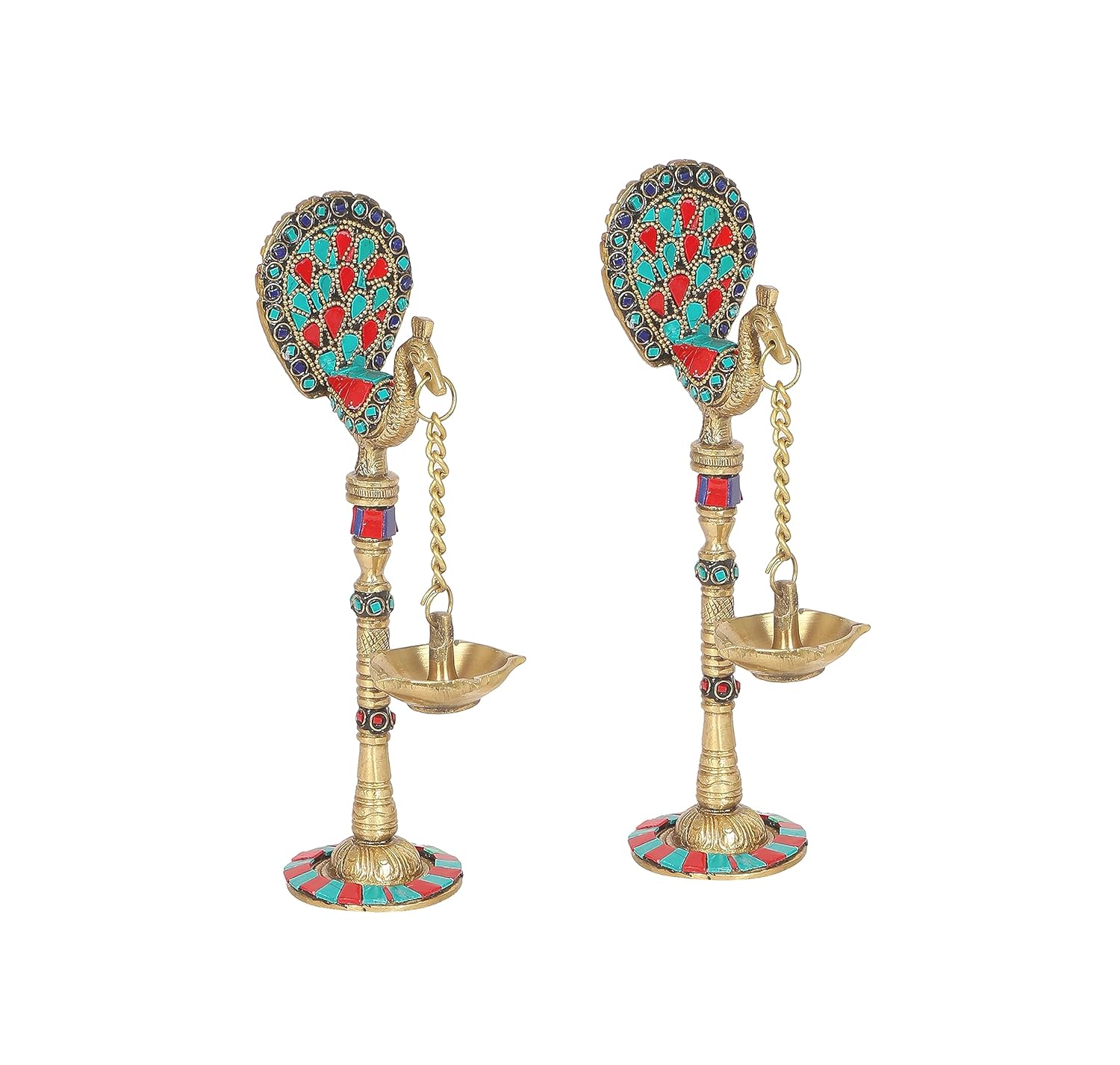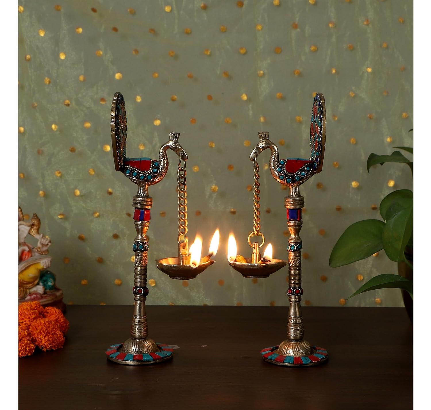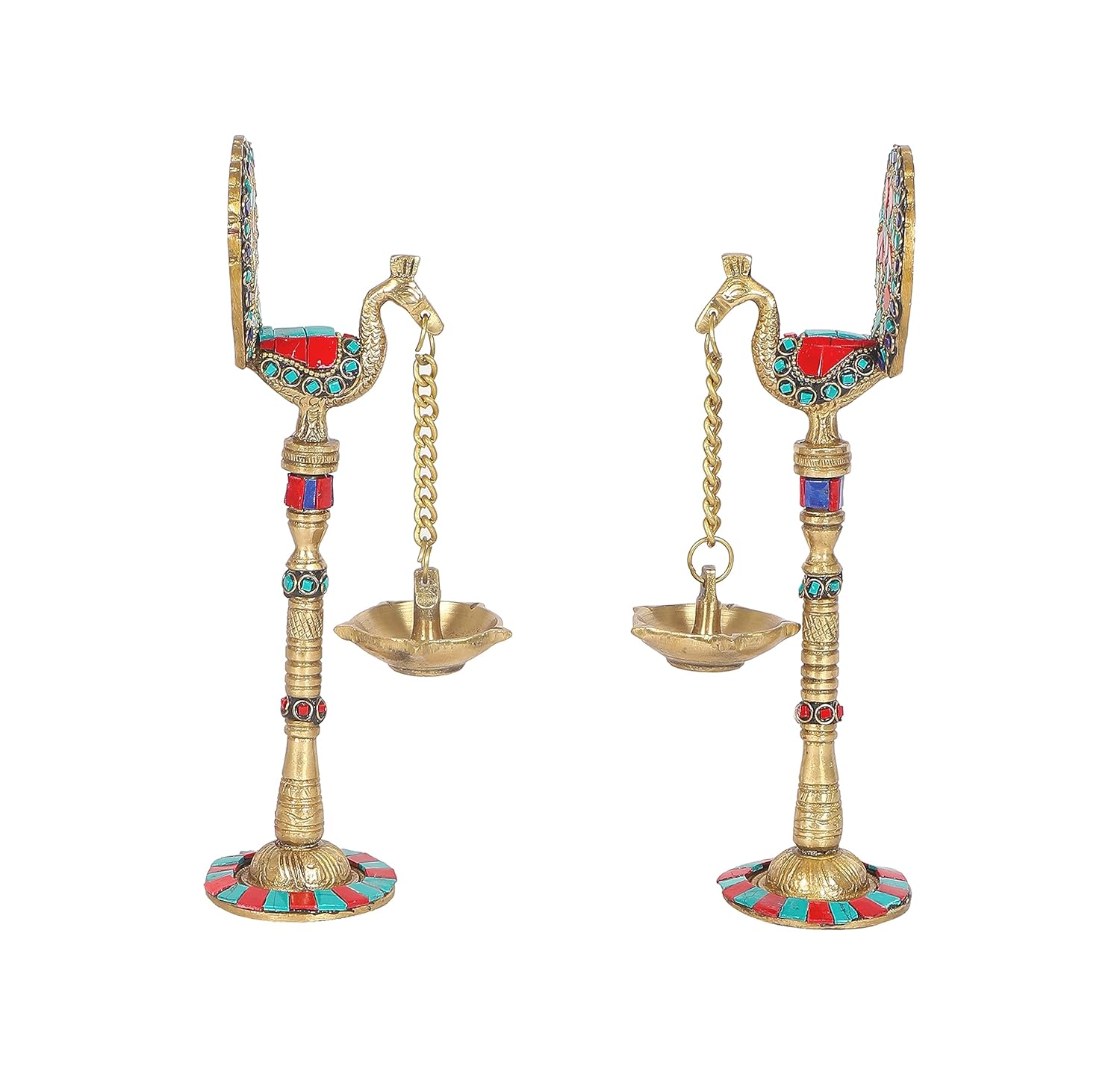 Two Moustaches Gemstone Work Peacock Design 9 Inches Brass Hanging Diya Pair, Brass Diyas for Decoration, Brass Oil Lamp, Brass Diya for Puja, Standard, Pack of 2